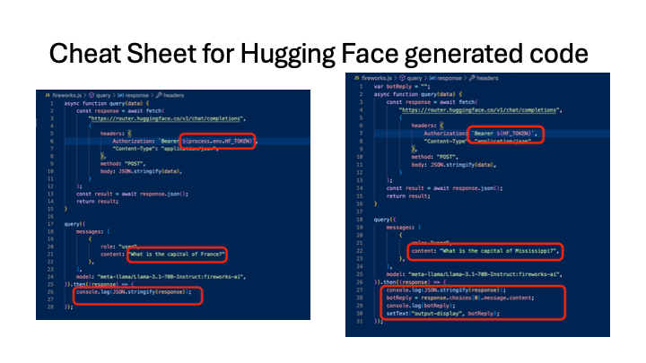 Quick Reference: Check out the Hugging Face Gen Code Cheat Sheet for what you will need to change on your generated code.